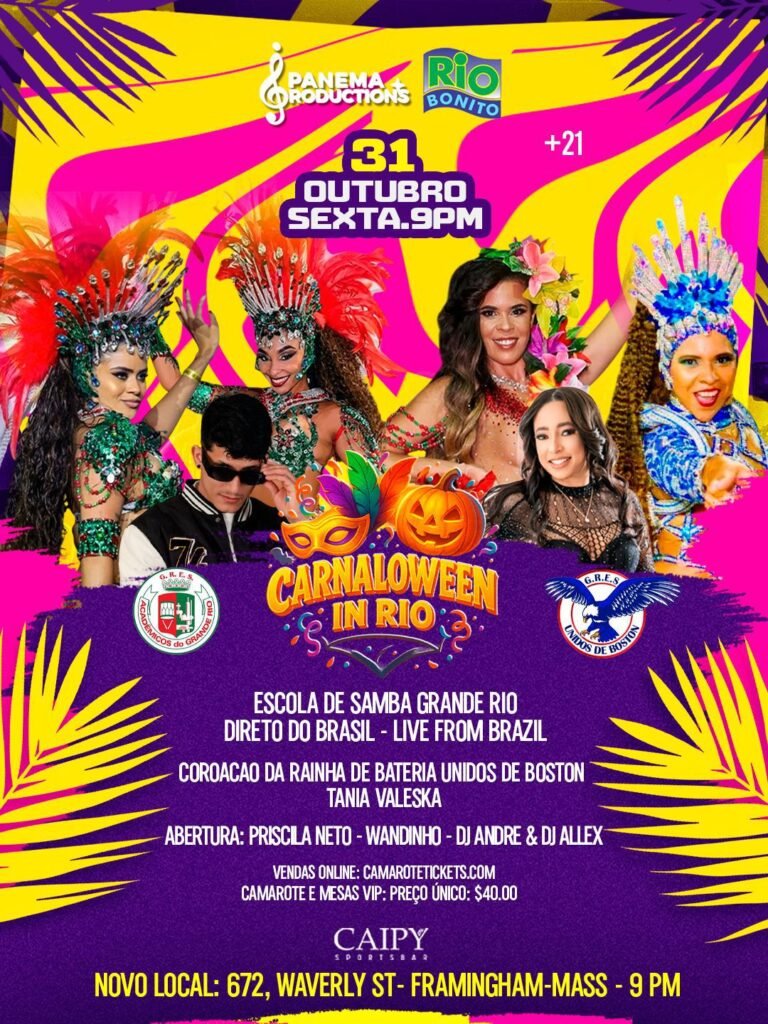 No dia 31 de outubro, o Caipy Sports Bar (672 Waverly St, Framingham, MA) vai virar uma avenida de pura folia com o Carnaloween in Rio! 🎭🔥