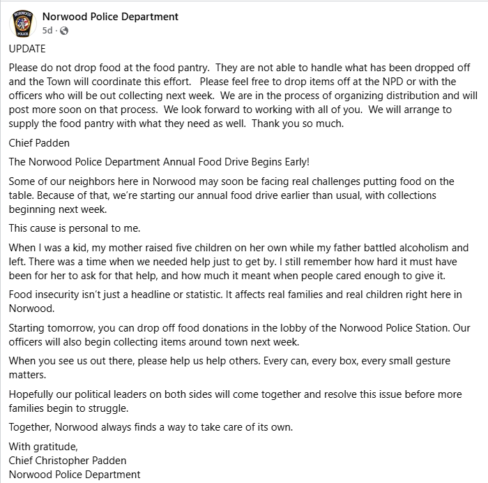 “Alguns dos nossos vizinhos aqui em Norwood podem em breve enfrentar dificuldades reais para colocar comida na mesa”, declarou o chefe de polícia Christopher Padden.