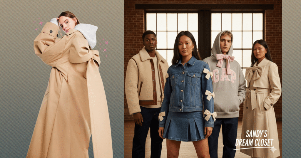 A assinatura de Sandy Liang está em cada detalhe: laços adornam hoodies, jaquetas trucker com acabamento em pele falsa, e até bonés de baseball. Há também blusas com gola Peter Pan em tons pastel, peças de renda e o icônico fleece da Gap reimaginado com o logo clássico da marca. Com preços que variam de $15 a $268, a coleção promete democratizar o estilo cool e nostálgico que fez de Liang uma das favoritas da Geração Z.