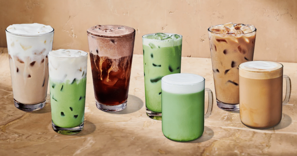 Além das bebidas geladas, a rede também lançou versões de Lattes e Matcha Lattes, quentes ou gelados, com leite enriquecido com proteína e opções de xaropes com ou sem açúcar.