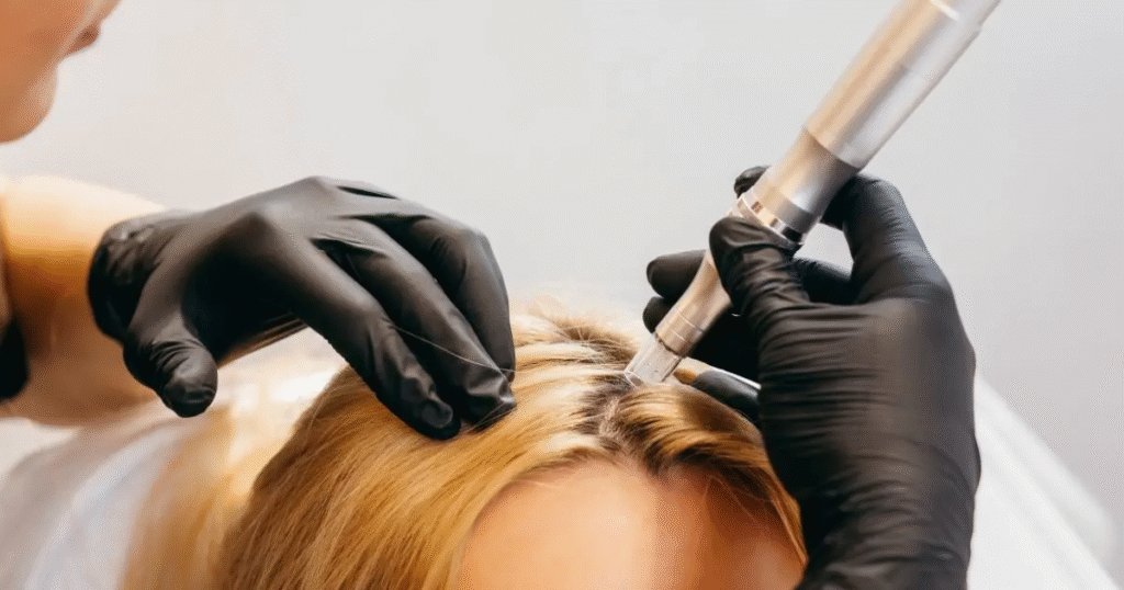 ✔ Aplicação do microagulhamento – uso de dermapen com profundidade adequada para estimular os folículos.