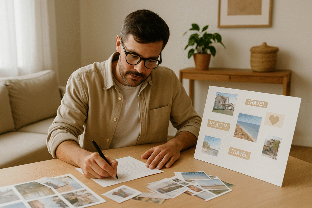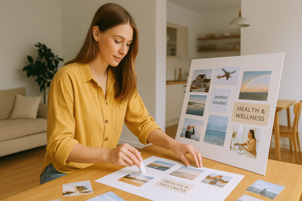 Você pode imprimir imagens, recortar de revistas ou até escrever com a própria letra palavras que representem seus objetivos. O quadro deve ser visto todos os dias — como um lembrete visual de quem você está se tornando.