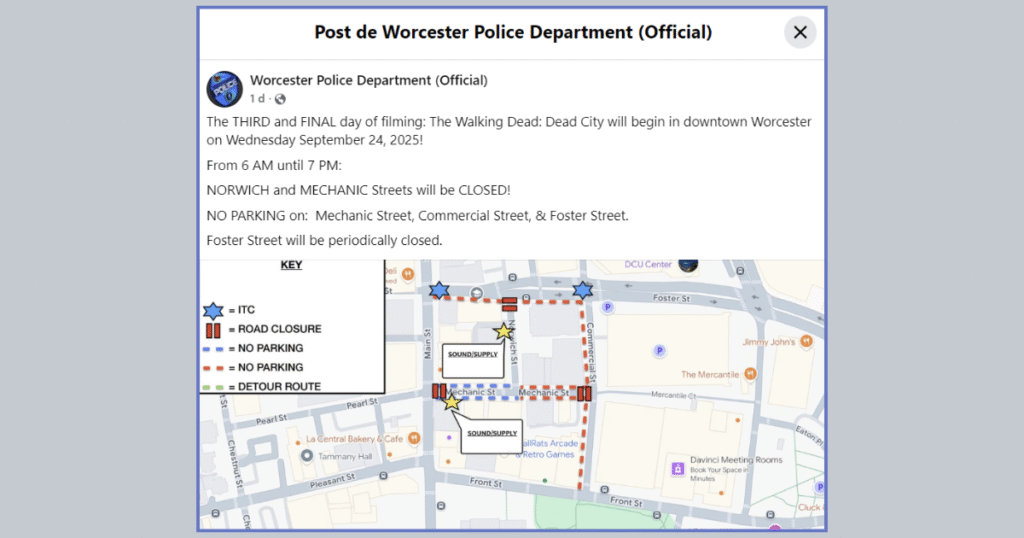 Para a produção da terceira temporada do spin-off de “The Walking Dead”, diversas ruas do centro de Worcester foram fechadas e adaptadas para recriar a atmosfera sombria e destruída da série. Carros destruídos, destroços e a estética pós-apocalíptica se tornaram parte da paisagem local, oferecendo um vislumbre dos bastidores para os moradores. Esta não é a primeira vez que a produção escolhe a cidade como cenário, já tendo realizado gravações em maio de 2024, o que reforça a posição de Worcester como um local viável e atrativo para grandes produções de Hollywood.